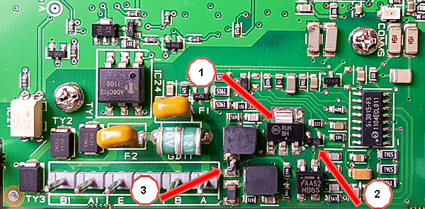 Infolge eine Blitzes ist mein analoges Modem der Secvest "verstorben". Vorerst, konnte ich 3 defekte Bauteile feststellen (siehe Bild). Nun habe ich aber leider das Problem, dass ich bei Bauteil 1 (nehme an, dass es sich hier um einen Spannungsregler handelt) mit der Bezeichnung "ON Semiconductors RUK BH" nichts herausfinden kann. Bzw. ist Bauteil 2 (Transistor) so zerstörrt, dass keine Typenbezeichnung mehr vorhanden ist. Nun meine Frage an die Gemeinde ob zufällig jemand nachsehen kann, wie die Beschriftung dieser Bauteile lautet oder ein Bild dieses Bereiches hat. Vielen Dank Zenz |