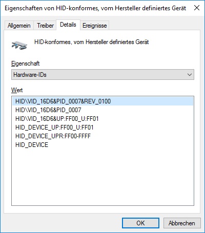 sollte die Treibererkennug schon mal ok sein. Denk aber dran, dass ein HID-konformes Gerät alles sein kann. Kriegt man nur raus indem man draufklickt dann bei Details Hardware IDs auswähltund die VID/PID prüft. Hier sollte dann beim 82T folgende Einträge zu sehen sein: VID = VID_16D7 PID = PID_0007 Hier würde ich noch mal das USB-Kabel vom 82T zur Zentrale auf festen Sitz prüfen (oder Kabel wechseln) und auch schauen ob das I.O ist. Ggf. mal den USB Port wechseln nicht das der eine Macke hat. Treiber werden immer pro USB Port installiert und erkannt. Hier auch dem System etwas Zeit geben den zu installieren, das kann schonmal etwas dauern. Bin mir bei Win10 jetzt nicht so sicher, da ich das selber noch nicht hier im Einsatz habe. Aber versuche doch mal die Olink Software als Administrator auszuführen. Rechtsklick und dann als Administrator ausführen. Was bekommst du denn als Meldung angezeigt? Gruß Christian Murphys Law: Man hat niemals Zeit, es richtig zu machen, aber immer Zeit, es noch einmal zu machen. |