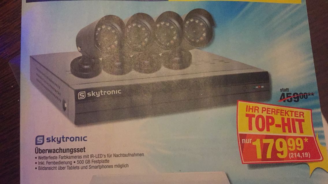 ab heute gibt es in der Metro von skytronic ein Überwachungsset für 180€ mit 4 Cam's und einen Recorder. Ich stehe noch komplett am Anfang... Was ist von dem Angebot zu halten? Hat jemand schon Erfahrung mit der Firma gemacht? Danke und Gruß!