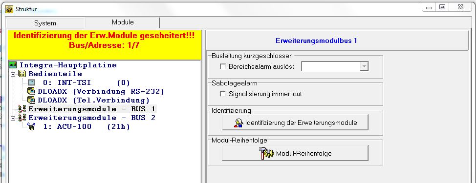 ich habe ein Problem bei der Einbindung des ETHM1-Plus Moduls an meine Integra 128Plus. Verkabelt habe ich korrekt und zunächst ohne RS232-Brücke. Das ETHM Modul ist alleine am Bus1 angeschlossen und hat die Adresse 7. Wenn ich in DLOADX die Identifizierung starte kommt es zum einen zum Sabotagealarm und zweitens gibt es in DLOADX die Fehlermeldung "Identifizierung der Erweiterungsmodule gescheitert! Bus/Adresse 1/7". Was könnte die Fehlerquelle sein? - LEDs am ETHM-Modul leuchten - Ein Netzwerkkabel ist nicht angeschlossen - TMP liegt direkt auf COM |