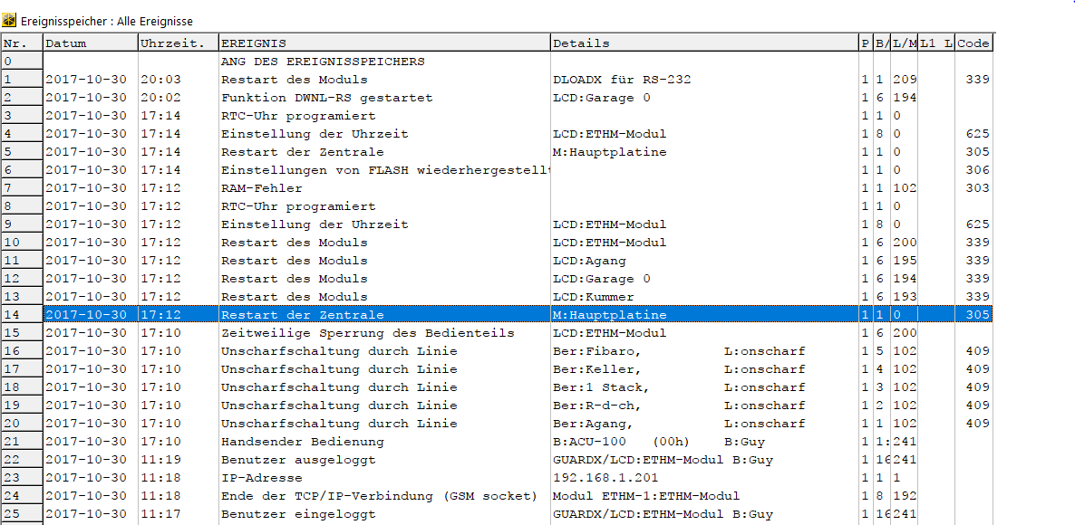 Danach habe ich den Ereignisspeicher weiter analysiert, und mir ist aufgefallen dass am Tag wo ich die Problemfirmware auf den Fibaro spielte, seltsame Fehlermeldungen auftraten. Das Ganze spielte sich so um den 16ten September ab. Am Anfang waren es Restarts der Hauptplatine und später UNKNOWN EVENT in Bereiche und Linien die ich überhaupt nicht nutze. |