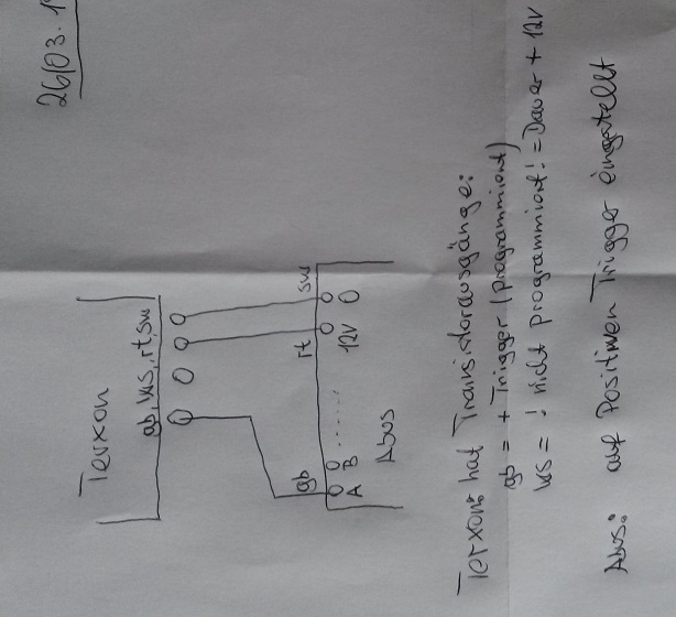(10-03-2018 20:21)trybear schrieb: Nun soll das neue Gerät nur mit rt und sw und einer Brücke zwischen 0 also Minus und Anschluß A funktionieren?Das passt schon. Im 2. und 3. Anschlußbild sind potentialfreie Kontakte eingezeichnet, die hat die Terxon S nicht. Stattdessen hat sie Transistorausgänge, die entweder offen sind(dann wird über einem pullup Widerstand +12V ausgegeben) oder intern gegen 0V geschlossen werden. Wenn du also einen Transistorausgang mit Anschluß A vom AZWG verbindest, dann schaltet dieser im Alarmfall gegen 0V durch, die zusätzliche Verbindung vom Schaltkontakt zu 0V macht der Transistorausgang intern und wird nicht benötigt. Hast du schon herausgefunden WELCHEN Transistorausgang(081-083, 151-158) du am Eingang A des Wählgerätes angeschlossen hast? Das solltest Du leicht herausfinden können, indem Du die Leitung vom Anschluß A in Richtung Zentrale verfolgst. Wenn Du das herausgefunden hast, kannst du dann überprüfen, welche Funktion für diesen Ausgang programmiert wurde. Und wenn die Funktion richtig ist, das Wählgerät trotzdem nicht wählt, dann müsste der Ausgang nachgemessen warden, ob er sich gemäß Funktion richtig verhält. Hier zB. berichtet ein user, dass sich einer der Ausgänge nicht richtig verhält. Nachdem er stattdessen einen anderen Ausgang verwendet hat, funktioniert es nun: http://www.alarmforum.de/Thread-SG1800-a...2#pid84262 mfg Sektionschef Abus Terxon SX+SG1800+BW8010+Monacor AS362 Jablotron Oasis80(JA-84)+JA-83M+JA-83P+JA-80PB+JA-81F+JA-80L Instar IN-5907HD |