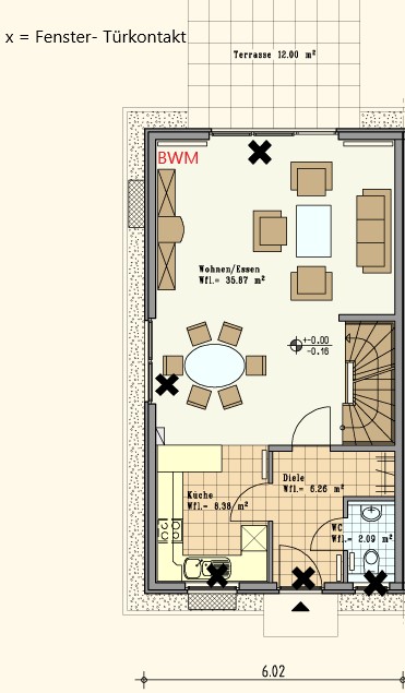 durch die vermehrten Einbruchsversuche in der unmittelbaren Nachbarschaft rückt das Thema Alarmanlage nun wieder etwas näher... Ausgangslage: Doppelhaushälfte gem. Grundriss Rollläden im EG (nachts immer runtergelassen) Fenster sind mit mehrfacher Pilzfkopfverriegelung ausgestattet und die Griffe abschließbar Eingangstür mit 7-fach Verriegelung Ich bin auf der Suche nach einer Alarmanlage die im Funk/WLan sendet, da ich keine Kabel verlegen + Wände schlitzen möchte. EG: 1x Bewegungsmelder 5x Tür-und Fensterkontakte 1x Außensirene Meldung bei Auslösung auf dem Handy Verschiedene Alarmzonen Optional für die Zukunft: RFID-Chip zur Scharf-oder Abschaltung Kameras (außen+innen) die man auch aus der Ferne übers Handy überwachen kann Rauch- und Gasmelder Rollladensteuerung (Smart Home) Bislang hatte ich mir nur mal Homematic + Coqon angeschaut. Preislich: bei den genannten Sachen EG inkl. Hauptzentrale (ohne die optionalen Sachen)ca. 500,-€ Vorab vielen Dank für die Vorschläge/Anmerkungen etc.... Gruß Karsten |