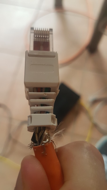 Er hat am Tisch getestet, da ging alles. Wenn er nun mit dieser Ausführungsqualität seine Kabel zusammengeschustert hat, wird ihm unterwegs je Kabel mindestens eine Unzulänglichkeit passiert sein. Also als erses Kabeltester, mach ich übrigens auch so, bevor ich die Kameras zusammenbaue. Mittlerweile nie mehr ohne Montagebox, gerade bei cat7 reicht der Radius definitiv nicht, es im Domegehäuse unterzubringen. Hier nutzen wir schon abgewinkelte 15 cm Patchkabel, seitdem no Probs. Alles andere ist Glücksgefiesel, da beim drücken der Kabel immer was passieren kann.