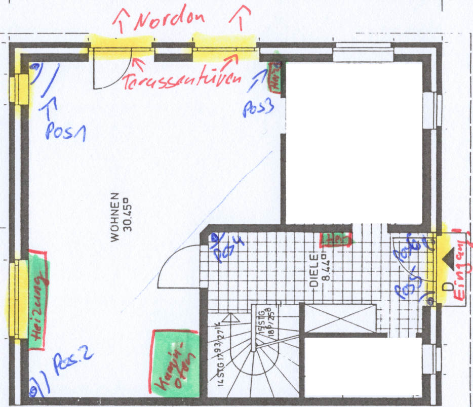 ich möchte an meiner Lupusec XT2 Plus als Rückfallebene 2 Bewegungsmelder installieren. Anbei habe ich den Grundriss von den 2 betroffenen Räume. Alle relevanten Glaselemente sind Gelb makiert, alle Wärmequellen Grün. Mögliche Positionen habe ich mit Pos 1,2,3,4,5 durchnumeriert. Raum 1) Flur. Die Eingangstür ist der einzige reguläre Zugang zum Objekt. Die Türe soll mit einem Öffnungskontakt ausgestattet werden, der dann die Eingangsverzögerung aktiviert. Die Eingangstür hat Glaselemente. Prinzipiell könnte der BM überall installiert werden, aus optischen Gründen habe ich aber mal Pos4, Pos5 und Pos6 als mögliche Positionen für den BM eingetragen Vom Flur geht es ins Wohnzimmer, küche , GästeWC und zur Treppe (keller / OG) Raum 2) Wohnzimmer. Hier befinden sich 2 Terassentüren mit Nord Ausrichtung sowie ein Kaminofen. Über den Terassentüren hängen vorhänge die u.U. auch Pos1 und Pos 3 überdecken könnten. Frage an die Experten: Wo würdet ihr die beiden BM installieren? Es handelt sich um dual way BM von Lupusec. Der Hersteller empfiehlt als Einbauhöhe ca 2m. was optisch natürlich immer etwas blöd aussieht. Kann man den BM bedenkenlos höher installieren und durch das Kugelgelenkt schräg nach unten ausrichten? Tiere / Saugroboter haben wir übrigens keine. Ich selbst hätte Pos1 im Wohnzimmer und Pos 4 im Flur bevorzugt. Es wäre schön wenn mir jemand bei meiner Frage helfen würde. Vielen dank schonmal und schönen Sonntag noch! Lupus XT2 plus |