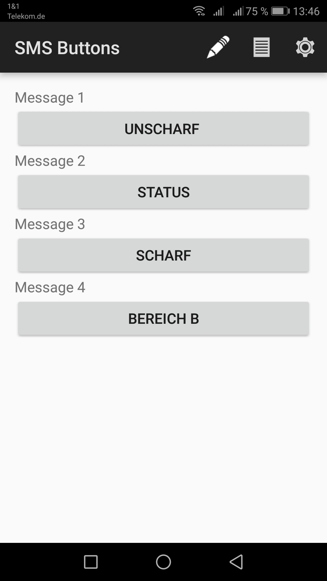 Ich benutze SMS BUTTONS um die vorgefertigten SMSen abzuschicken. Habe gerade nur festgestellt, das die Android APP im App Store nicht mehr zu finden ist. Hat jemand vielleicht eine schicke Alternative? Wie Tim schon geschrieben hat, Code für die Bereiche anlegen. Bsp. SMS an: 017312345678 Text: 9999 SCHARF (9999 = Code für Bereich A) (Befehl = SCHARF, UNSCHARF oder STATUS) Die Anlage schaltet dann stumpf SCHARF auch bei geöffneten Fenstern usw.. Und es dauert halt immer ein bisschen bis die SMS angekommen ist. Schönen Sonntag noch |