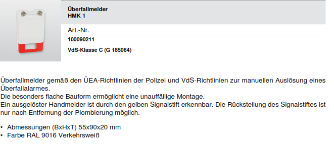 Der ND100 wird auch von Honeywell verkauft. Ist der runde Typ. Der eckige Typ hat dieses in jedem Fall nicht. Die Melder, die Vanderbilt aktuell im Programm hat, sind 1:1 die gleichen, wie Honeywell, also der Bosch ND100 und der 03159x. Zu Zettler und Hörmann kann ich nichts sagen. Zum HMK1: Der Melder hat aktuell noch eine VdS-Anerkennung für die Klasse C, verlängert 2016. Damit muss der Melder aktuell die VdS 2271 erfüllen, die folgendes besagt: Zitat:10.6 Erneute Auslösung Überfallmelder der Klassen B und C müssen so ausgeführt sein, dass spätestens 10 s nach Ende der Einwirkung eine erneute Auslösung (Alarmwiederholung) der angeschal-teten Primärleitung/angeschlossenen Meldergruppe möglich ist (ausgenommen erneute Betätigung eines Geldscheinkontaktes). Und da es kein GSK ist, muss man dieses erneut auslösen können. |