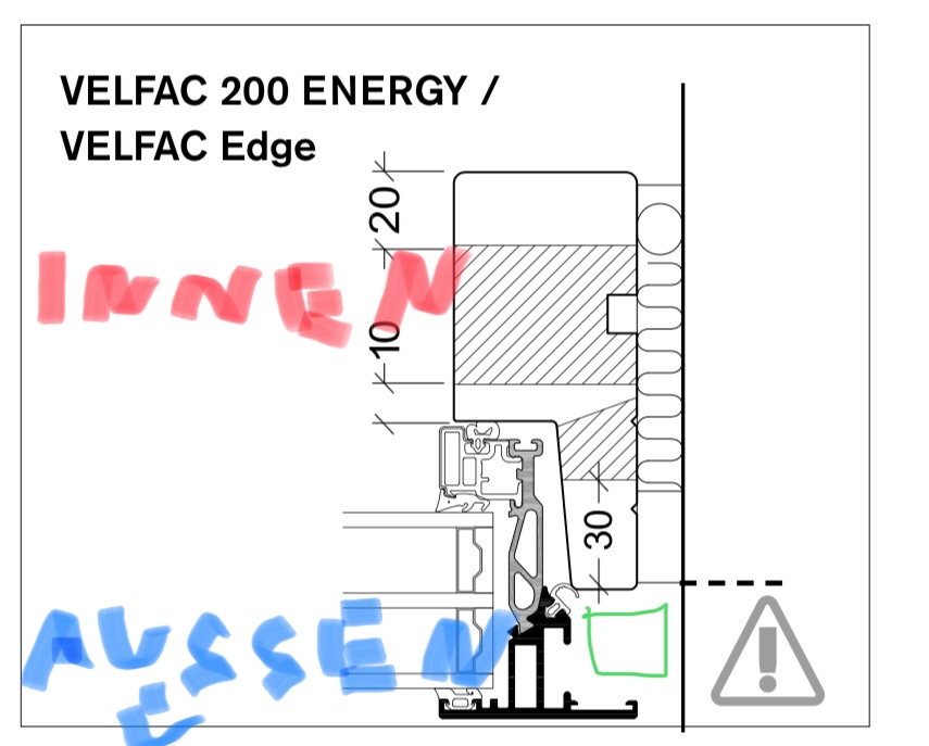 ich wollte mir eigentlich eine Satel Integra kaufen und zur Zeit versuche ich die letzte Unklarheit zu beseitigen. Wir haben Fenster der Marke Velfac die sehr schön aber leider auch technisch ganz anders als alle „normalen“ Fenster in Deutschland. Sie öffnen nach außen und bieten keine mir bekannten unauffälligen Montagemöglichkeiten der Öffnermelder AXD-200. Das folgende Bild zeigt in etwa den Aufbau der Fenster. Meine Idee war nun den Sensor an der Grünen Markierung zu montieren - dadurch wäre der Melder vor Regen soweit geschützt aber würde der Temperatur von außen direkt ausgesetzt sein. Würdet ihr so etwas machen? Gruß Jan |