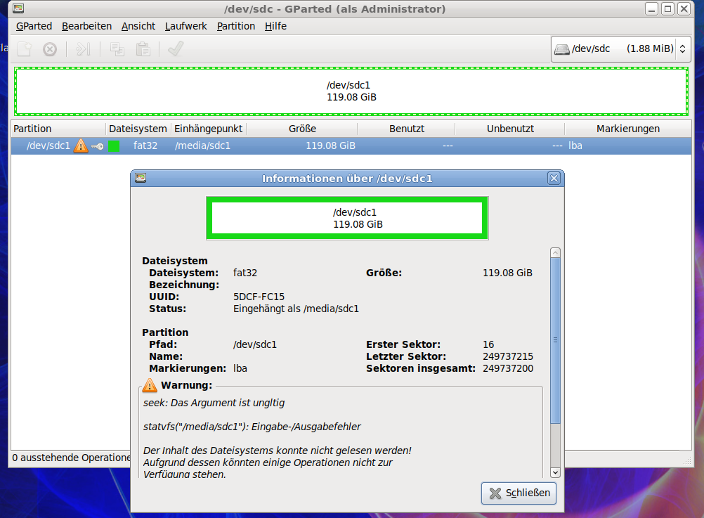 ich kann unter Windows nicht mehr auf eine SD-Karte zugreifen ("kein Zugriff"). Die war vorher in einer Hikvision als lokaler Speicher eingesetzt und funktionierte auch. Karte wurde später neu formatiert und nicht mehr als Speicher genutzt. Karte wurde herausgenommen, als die Cam stromlos war. Unter Linux wird die Karte mit 2MB erkannt. Hat aber 128GB. Der Linux Partitionierer Gparted gibt unter: - Ubuntu nur 1,88 MiB unbenutzt an - Knoppix 1,88 MiB aber 119,08GB an Was ist beim formatieren durch Hikvision passiert? Wie kann ich die Karte wieder nutzbar machen? |