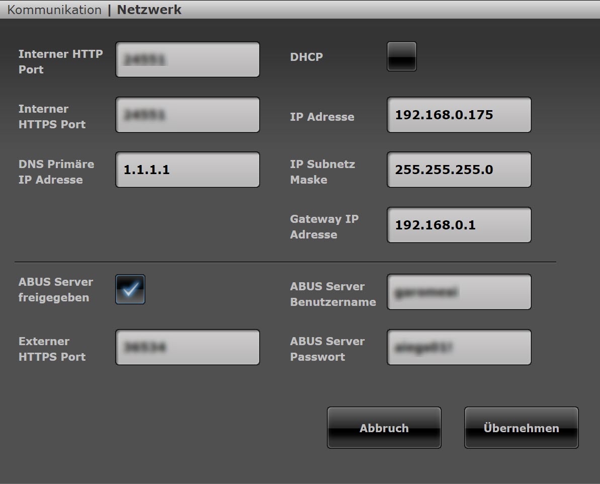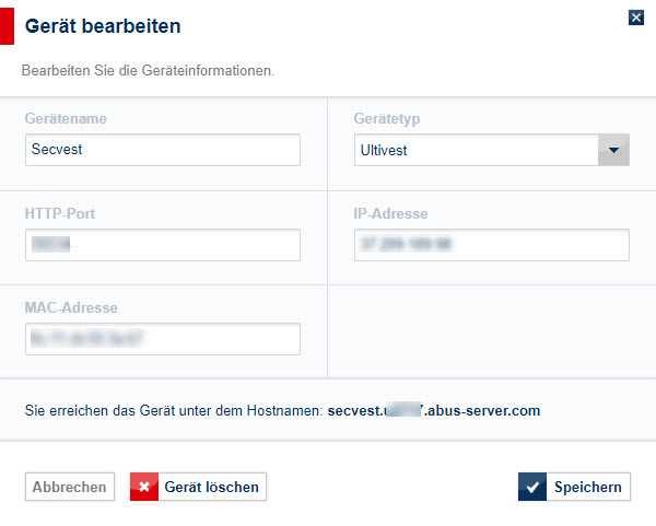 Ich habe die folgenden Infos hinterlegt: Dabei verwende ich unterschiedliche Port Nummern für INTERN und EXTERN. Weiter habe ich den Benutzername und Passwort hinterlegt, welches ich für den ABUS Serverdienst verwende. Ich gehe davon aus, dass diese Daten für die ABUS Secvest nötig sind, damit diese Daten an den Serverdienst weiter geleitet werden. In der FritzBox habe ich erfolgreich die Portweiterleitung aktiviert. Damit kann ich nun von aussen auf die Anlage zugreiffen. Was ich nicht verstehe ist dieser ABUS Server Dienst: Erstens kann ich nur die Ultivest Anlage anwählen ....... Mit der kann ich mich dann verbinden und gelange auf folgendes Bild: Aber welchen Benutzername und welches Passwort muss ich hier eingeben, damit ich auf die Secvest komme? Auch auf der mobilen App wird nach diesem Benutzername und Passwort gefragt. Vielen Dank im Voraus für euer Tipp. |