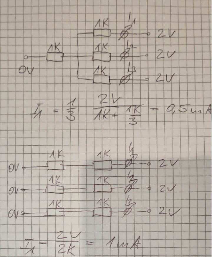 Ich habe es mir nochmal durch den Kopf gehen lassen... Anbei mein Ersatzschaltbild, wenn alle drei Fenster offen sind ( Linienspannung 2V, Widerstand 1K). In oberen Fall würde pro Linie 0,5 mA fließen. Die Anlage würde einen Linienwiderstand von 4k (2V / 0,5mA) messen, im unteren Fall richtige 2K (2V / 1mA). |