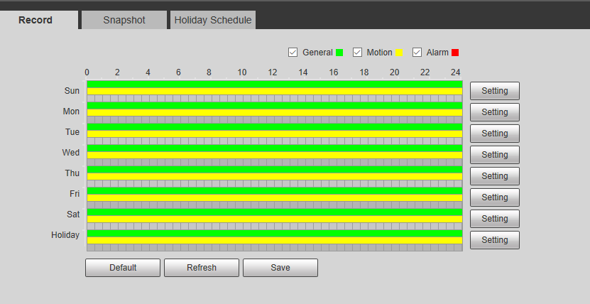 Bei deinem Bild Oben mit dem grünen und Blauen Streifen (Das müssten die Einstellung für Speicher sein) hast du eingestellt, dass immer aufgezeichnet werden soll und bei Alarm UND Bewegung, wenn du aber kein Alarm(zum Beispiel Eingangskontakt am Rekorder) hast aber Bewegung, dann erfolgt keine Aufzeichnung. Es ist eine UND Verknüpfung. Du musst das so einstellen, dass dort ein gelber Balken ist (MD) und für Daueraufzeichnung grün.