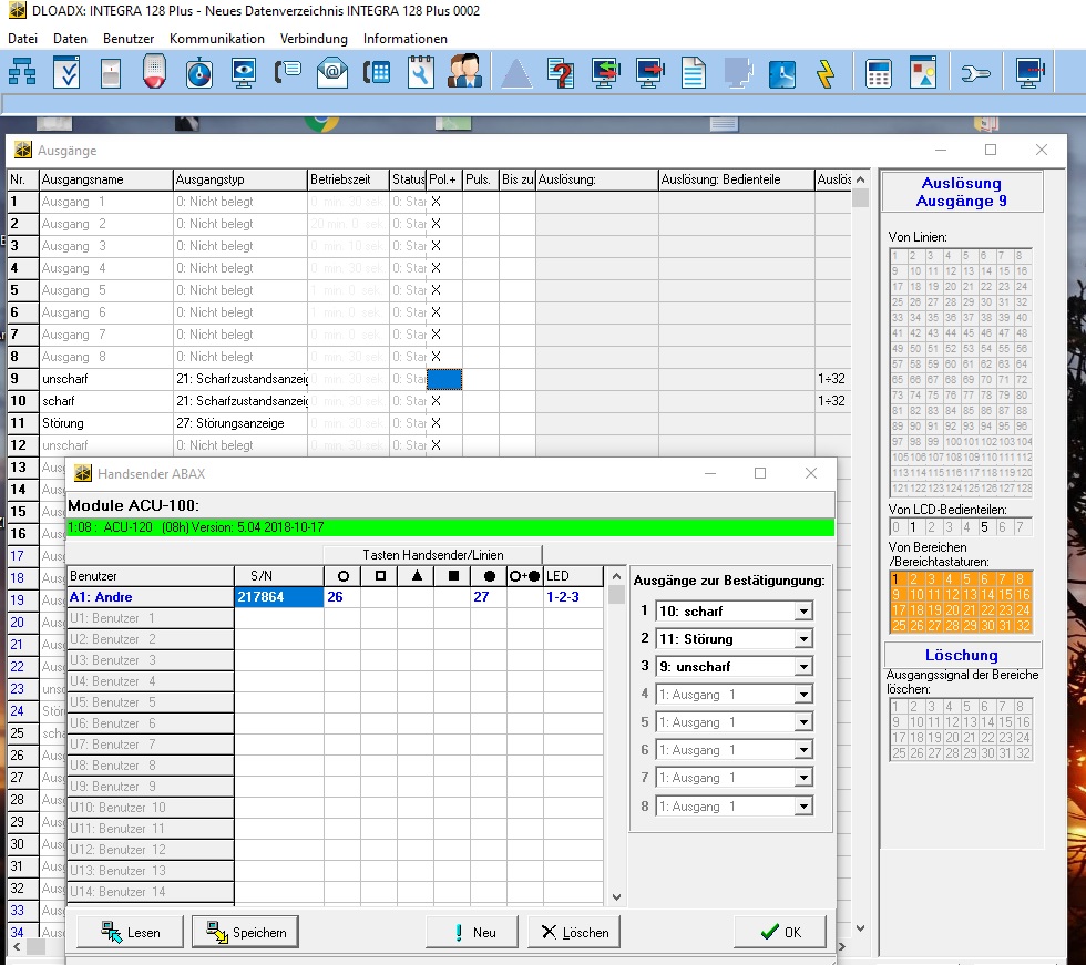 vielleicht kannst du mir ja noch einen Tipp geben. Ich würde gerne über die LEDs auf dem Handsender eine Optische Rückmeldung über den Zustand der Anlage realisieren. Leider bekomme ich es nicht hin. Ich habe mal meine Einstellung hochgeladen, vielleicht kannst du da ja erkennen warum es nicht klappt. Ich bekomme leider keine Rückmeldung vom Handsender. Wenn ich über die Fernbedienung scharf bzw. unscharf Schalte dann blinken alle 3 Leds für ein paar Sekunden und das wars. Habe es genauso gemacht wie in der Anleitung hier im Forum beschrieben. Kann man das blinken eigentlich irgend wie ausschalten? Was hat das für einen Hintergrund? Reagieren tut die Anlage ja in dem Moment wo man die Taste drückt. Gespeichert habe ich dieses mal selbstverständlich