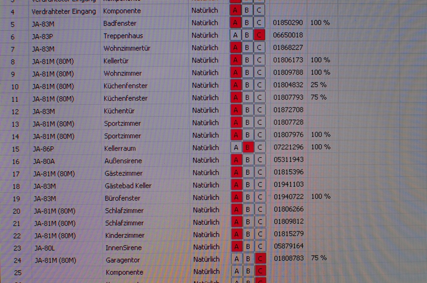 das einfachste ist erst einmal Software öffnen, als Errichter anmelden, in die Komponenten Liste schauen und das Fenster auf und zu machen. Dann steht am Ende des Eintragen unter LEVEL ein Prozentwert. Der sollte mindestens 50% betragen. Geht in Stufen 25 / 50 / 75 / 100% Das kannst du ganz einfach selber machen. Die SIGNALMESSUNG zeigt dir an ob dort Dauersender vorhanden sind. Dann ist da fast alles mit Balken versehen. Gruß Tim Ich habe nicht auf jede Frage die passende Antwort, aber zu jeder Antwort die passende Frage. Auch wenn es Wenige ärgert, im Zweifelsfall geht mir Information vor Rechtschreibung. |