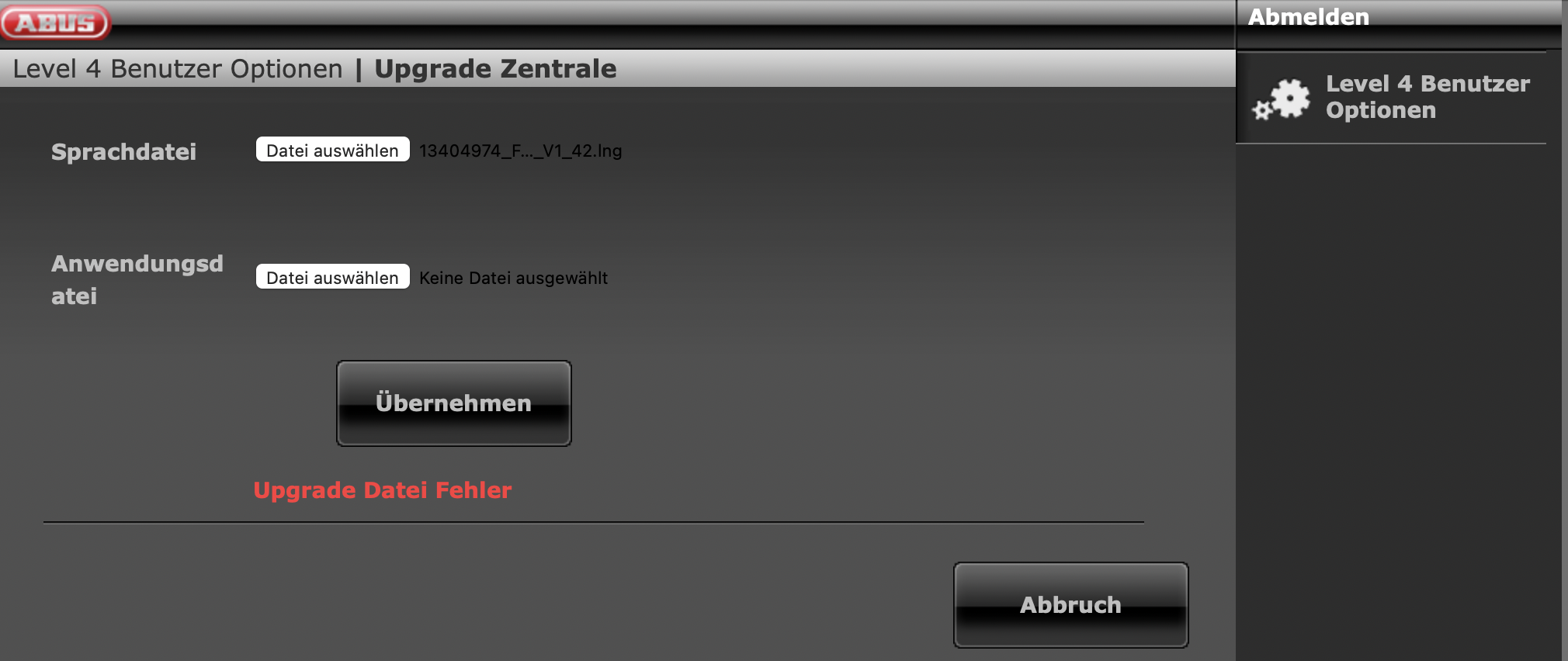Der Screenshot war nur ein Beispiel, dass es den Level4 schon in der Version v1.01.00 gibt. Ich hatte auch versucht beide Dateien auswählen und das Update durchzuführen, aber auch dort kam die Fehlermeldung. Ich werde, wie empfohlen, ABUS direkt kontaktieren und hoffe das mir dort geholfen werden kann. |