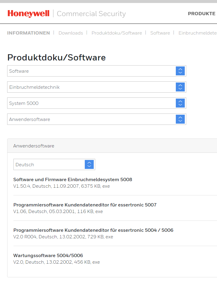 (29-05-2021 22:17)safety77 schrieb:(28-05-2021 23:05)5624 schrieb: Die Tools 5008 bekommt man bei Honeywell und nicht bei Esser. Die 5000er sind zwar Esser-Zentralen und nutzen den Esserbus, aber es wurde irgendwann mal eine Grenze gezogen. Esser Brand, Honeywell Security Einbruch. Gerade eben im Download-Bereich von Honeywell gesehen. Unter Systemsoftware bekommt man auch die Firmware. Die Doku findet man unter Technische Dokumentation => Einbruchmeldetechnik => MB-Classic => EMZ 5008 bzw. EMZ 5008 C. Dein einziges Problem ist: Ich stelle niemandem geschützte Software bzw. Dokumente zur Verfügung, da ich keinerlei Recht dazu habe, diese zu verbreiten. |