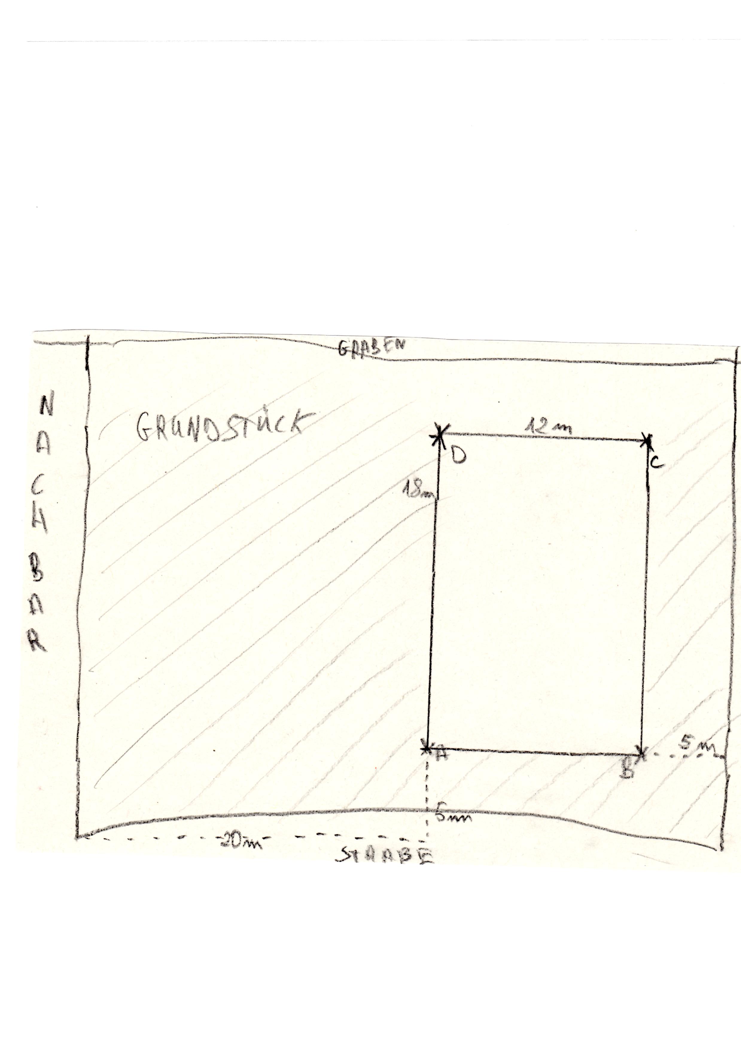 Ich möchte gerne eine Kamerüberwachung für eine kleine Halle einrichten. Die Maße und die Lage bitte der Zeichnung entnehmen. Wichtig ist mir, dass die Front des Gebäudes bis zur Straße, und die linken und rechten Gebäudeseiten jeweils bis zum Nachbarn, überwacht werden. Hab die genannten Flächen schraffiert. Aufnahme soll Tag und Nacht erfolgen, wobei die Aufnahme durch eine Bewegung gestartet werden soll. Kameras sollen am Gebäude angebracht und per Kabel verbunden werden. Habe mir überlegt eine Kamera am Punkt A anzubringen, die nach rechts filmt. Eine Kamera an Punkt B anzubringen die nach links filmt. Und jeweils eine Kamera an Punkt A und B, die nach oben (Richtung Graben) filmen. Und noch eine Kamera die zB bei Punkt D montiert ist und Richtung C zeigt. So müsste die Komplette Fläche abgedeckt sein. Kann man das so machen? Gibt es bessere Lösungen? Über Beiträge würde ich mich sehr freuen! :-) |