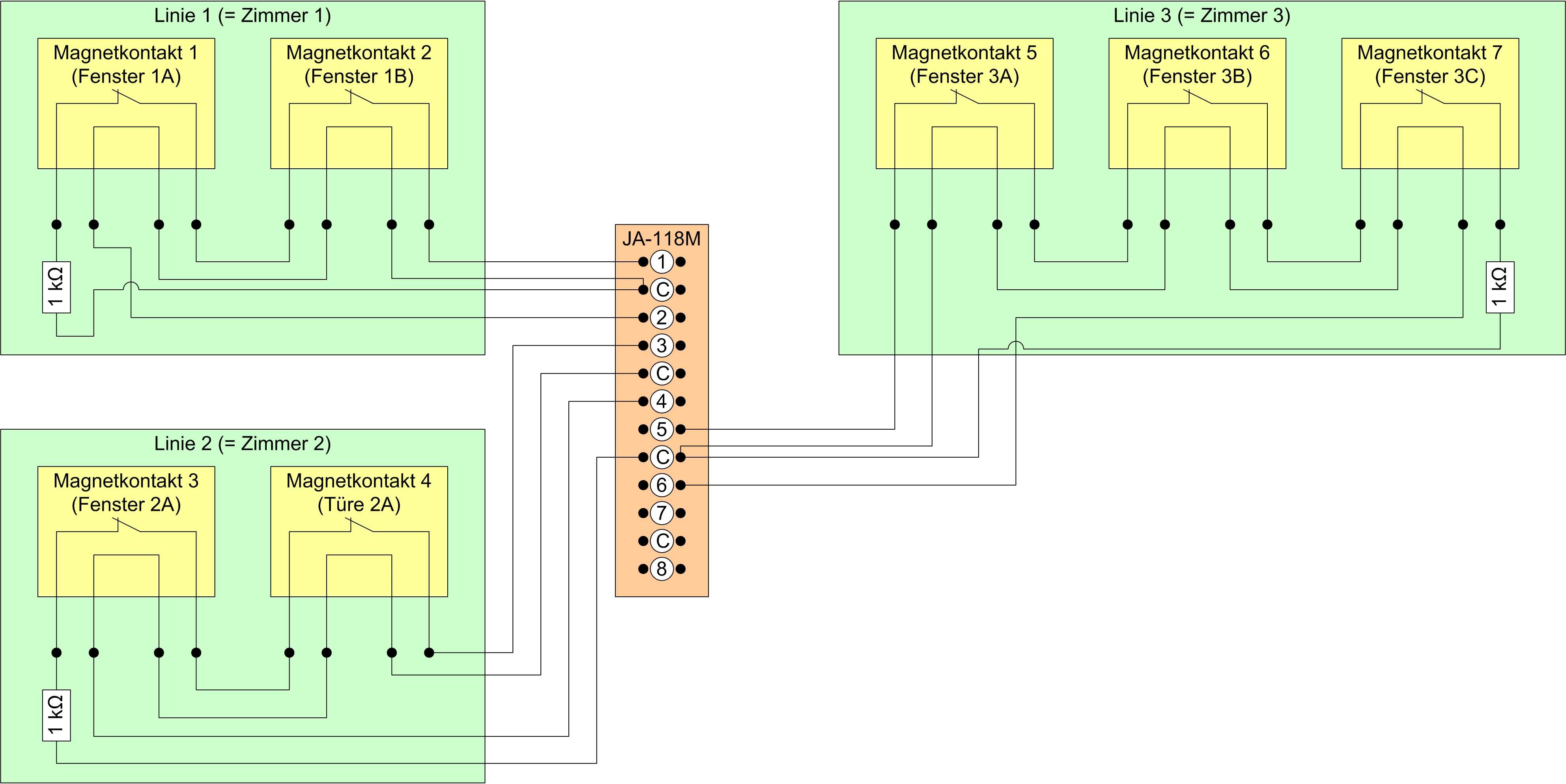 Von den Fenstern kommt das 4-polige Kabel der Magnetkontakte. Ich muss dann zwei dieser Fenster zu einer Linie zusammenfassen und dann im Technikraum an das Modul JA-118M anschließen. Das Modul 118M hat 8 Eingänge 1-8 sowie 4 Eingänge "C" (="common line"). Welche Pole der Magnetkontaktkabel muss ich wie zusammenschließen, sodass diese eine Linie ergeben? Sind zus. Widerstände erforderlich, oder nicht? Und welche Pole werden dann an welche Eingänge im Modul 118M gelegt, sodass auch der Sabotageschutz funktioniert? Jeder Tipp würde mir helfen, ganz besonders aber natürlich eine Skizze/Schema. Die Skizze der Original-Beschreibung (siehe Attachment) hilft mir Anfänger nicht weiter, da dort nur 2-polige Kontakte beschrieben sind, ich also nicht herausfinden konnte, wie man 1. die Sabotagelinie hier korrekt verdrahtet und 2. man mehrere Kontakte zu einer Linie zusammenfasst. |