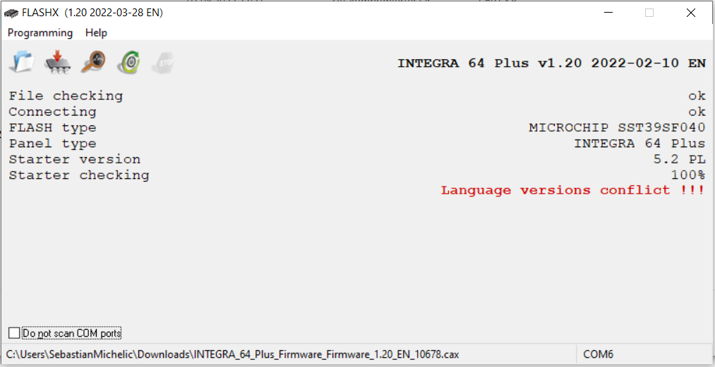ich hätte versucht meine Integra 64 Plus auf die neueste Firmware upzugraden (ich habe eine EN Zentrale und habe die EN Version der Firmware genommen). Nun kommt die Fehlermeldung "Language Version conflict" ... könnte das daran liegt, dass die Starter Version mit Suffix PL (Polnisch) ist? Weiß jemand wie man das behebt? |