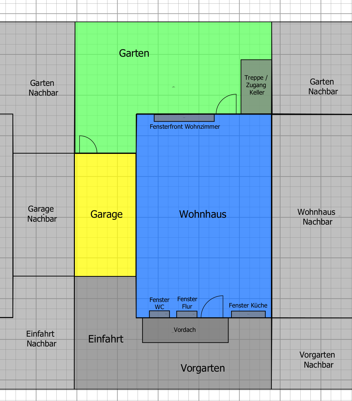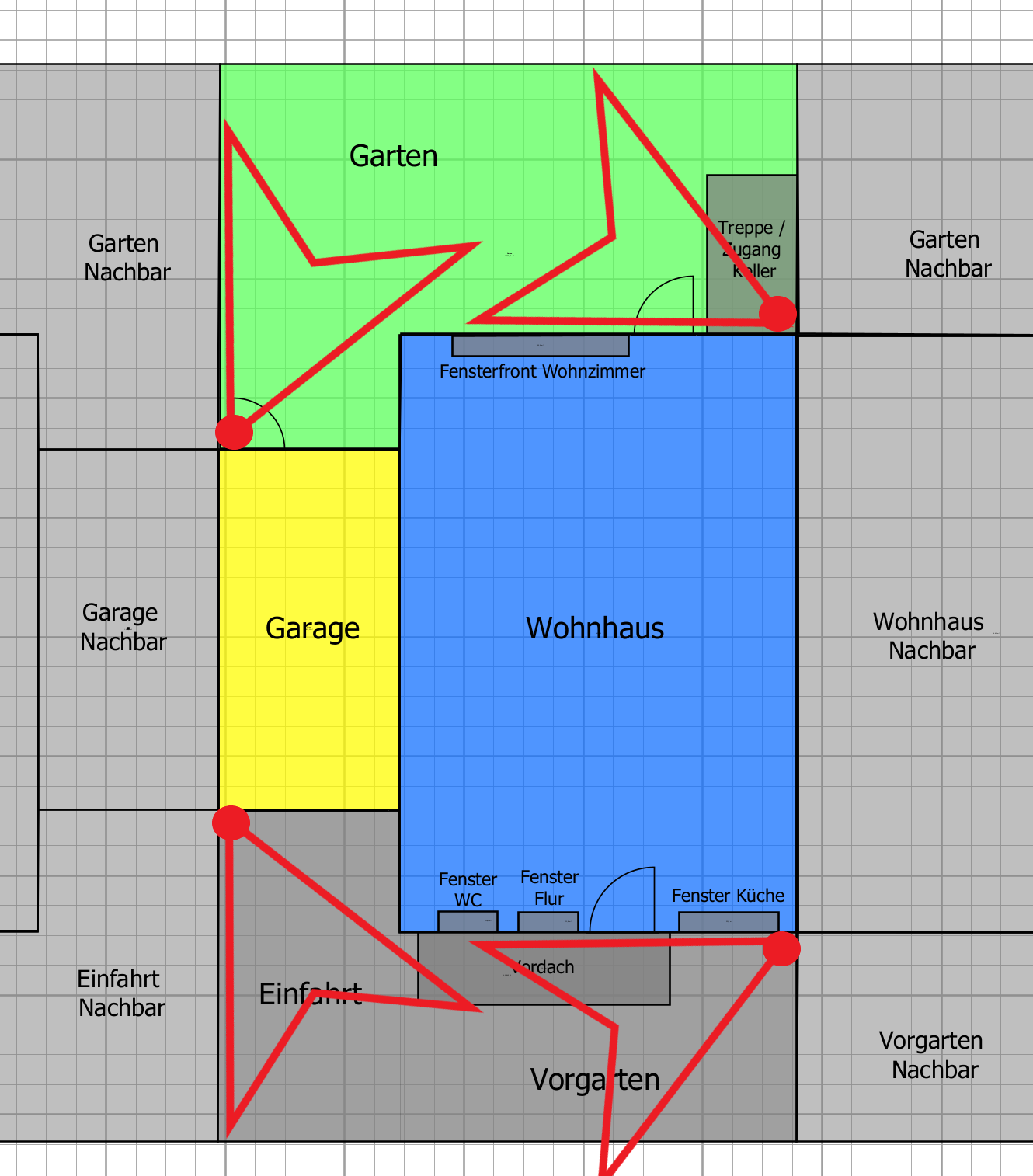 ich bin neu hier und so frech, direkt um eure Hilfe zu bitten. Wir sanieren gerade eine Doppelhaushälfte und spielen dabei mit dem Gedanken eine Videoüberwachung einzubauen. Welche Marke/Modell/System ist im Moment noch offen, lediglich die Verkabelung/Ansteuerung via IP+PoE ist für mich gesetzt. Ich habe auf die Schnelle eine "in etwa" maßstabsgetreue Zeichnung angefertigt und auch schon einmal mein Bauchgefühl bezüglich der Kamerapositionen eingefügt. Was sagt ihr dazu? Ergibt das Sinn? (Ist die Zeichnung überhaupt verständlich?) Gibt es Fallen oder Besonderheiten auf die ich achten sollte? Ich bin gespannt auf euer Feedback! |
