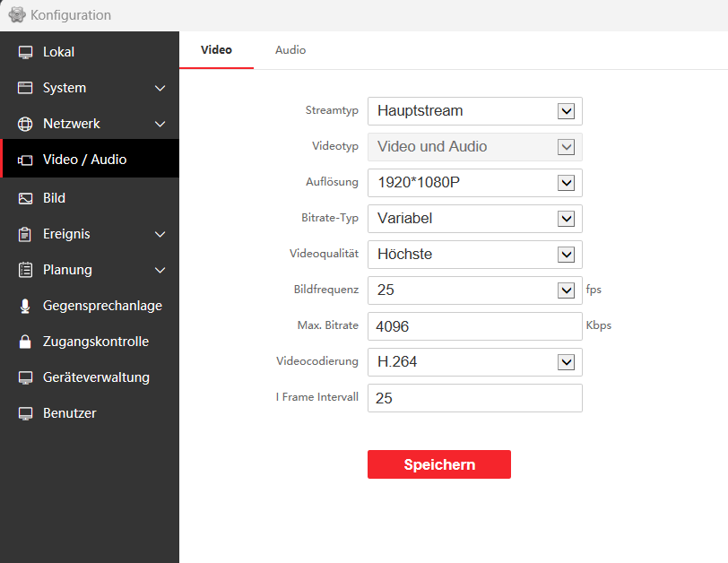IVMS-4200 bei Aufruf der Konfiguration der Türstation der Menüpunkt "Video/Audio" wählbar und dort die Untermenüs- Kameraname - Streamtyp - Videotyp - Auflösung - Bitratetyp - Videoqualität - Bildfrequenz - max. Bitrate - Videocodierung - I Frame Intervall Entweder hast Du eine andere Version oder irgendwo ist was faul