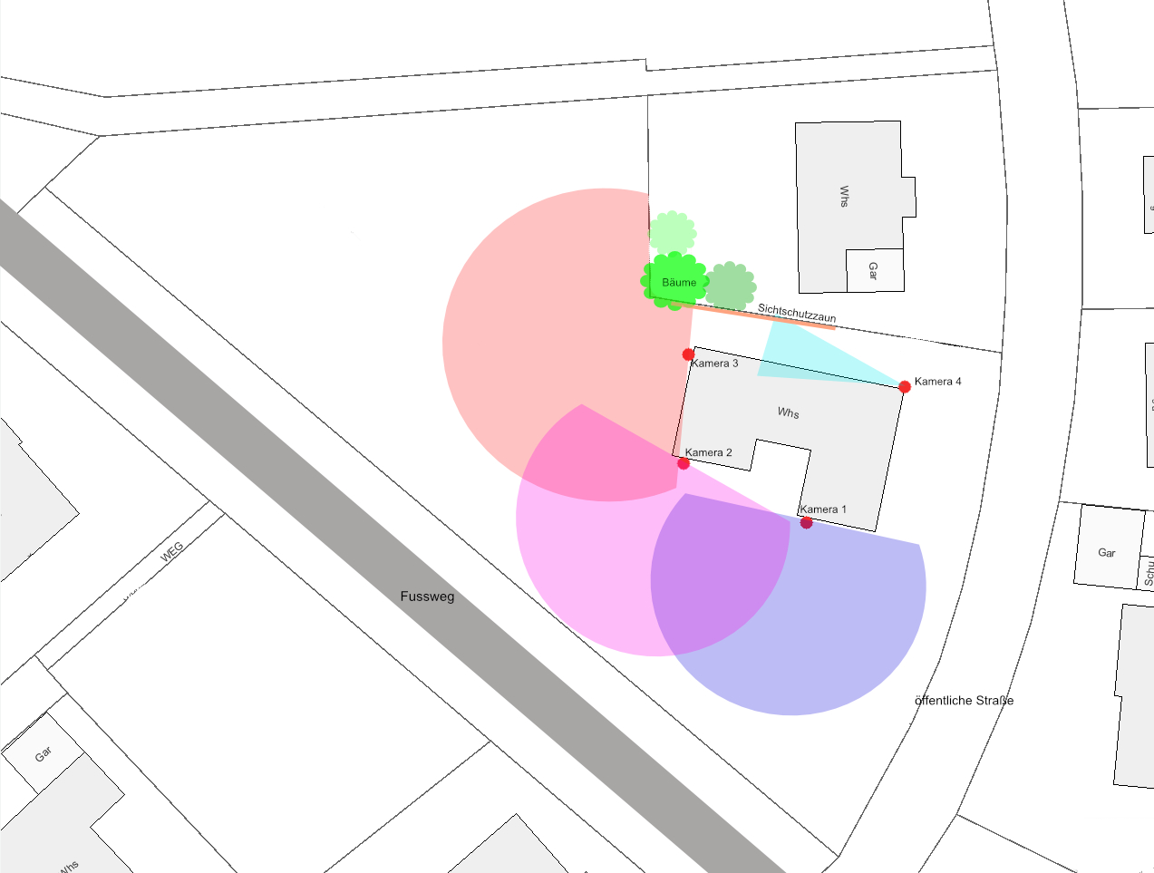 Klar verstehe ich auch, dass eine Ferndiagnose immer bescheiden ist. Daher vielen Dank für Deinen Hinweis! Damit ihr euch es besser vorstellen könnt, habe ich eben Fotos von den Sichtverhältnissen der möglichen Kameras gemacht und diese auf einem Grundriss eingezeichnet. Wie es sich hier dann mit Reflektionen im IR-Bereich verhält kann ich nicht sagen. Alternativ wäre auch das Anbringen von ein paar Scheinwerferns eine Option. Aber dies ist dann Schritt 2 für mich. Meine Hauptfrage ist daher noch immer, welche professionellen Empfehlungen es für meine erst mal "einfachen" Anforderungen: 1. "gescheite" Outdoor-Kameras 2. Anbringung als Einbau unter, bzw. an die Decke 3. ca. 180 Grad Blickwinkel 4. Speicherung auf NVR mit Zugriff über lokales Netzwerk / IPhone 5. Bewegungserkennung bei Personen mit Meldung auf Handy gibt. Da ich davon ausgehe, dass bei dem von mir gesteckten Preisrahmen gewissen Features dann schon Standard sind, gehe ich hier nicht näher drauf ein. |