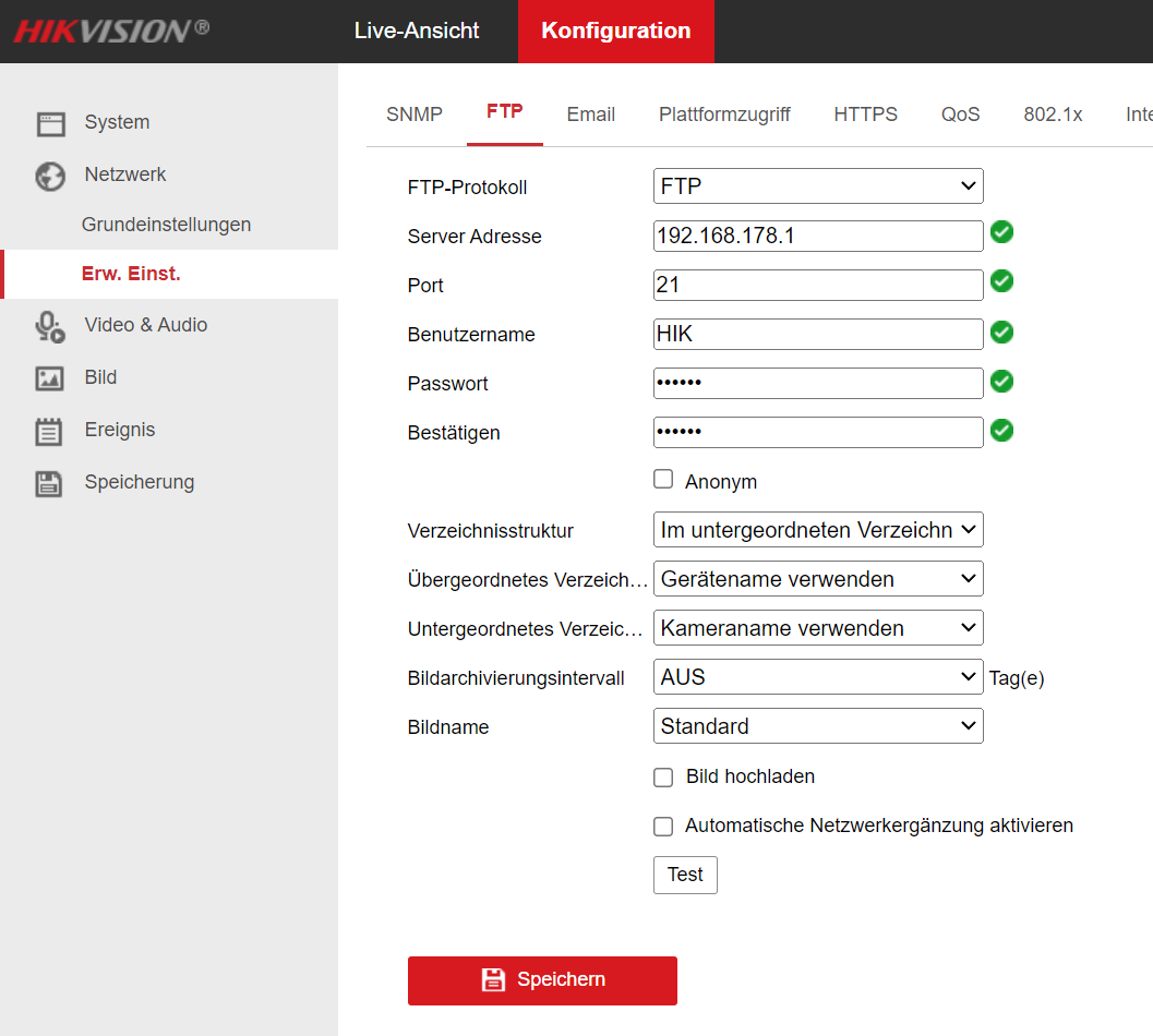auf der Suche nach einer Lösung habe ich in diesem Forum ein paar Threads genau zum gleichen Problem wie ich es jetzt habe gefunden. Leider steht in den Threads keine Lösung dir mir helfen würde. Ich versuche eine neue HikVision DS-2CD2T87G2H-LI über die Weboberfläche mit meiner Fritzbox 6591 Cable als NAS Speicher einzurichten. Beim einrichten über FTP Menü, bekomme ich jedesmal die Fehlermeldung: Fehler beim Installationsverzeichnis des NAS-Servers; ungültiges Verzeichnis. Mein Setup: In der Fritzbox steckt ein 32GB USB Stick, formatiert mit NTFS. Ich habe einen Benutzer erstellt, der auf diesen Stick Zugriff hat. Der USB Stick hat den Namen ESD_USB. Der Benutzer hat ausschließlich Zugrifsrecht auf diesen USB Stick. Auf dem Stick habe ich Testhalber einen Ordner angelegt "HIKVISION". Ich habe auch als Test dem Fritzbox Benutzer ein Recht gegeben ausschließlich auf diesen HIKVISION Ordner zuzugreifen. Es kommt trotzdem immer wieder die selbe Fehlermeldung. Auch habe ich den ESD_USB und HIKVISION Ordner freigegeben. Auf der Weboberfläche der HIK Cam habe ich unter Netzwerk/Erweiterte Einstellungen/FTP alles erforlgeich einerichtet. Ein Test ist auch erfolgreich. Gehe ich nun auf Speicherung/Speicherverwaltung/Netzlaufwerk/ und gebe da die Fritbox IP Adresse ein und den Dateipfad, bekomme ich die genannte Fehlermeldung. Als Dateipfad habe ich schon probiert: / /ESD_USB /HIKVISION /ESD_USB/HIKVISION In der Fritzbox ist unter Heimnetzfreigabe alles aktiviert. Auch "Unterstützung für SMBv1" ist Testweise aktiviert. Könnte mir damit jemand weiter helfen? Vielen Dank im Voraus Waldemar |