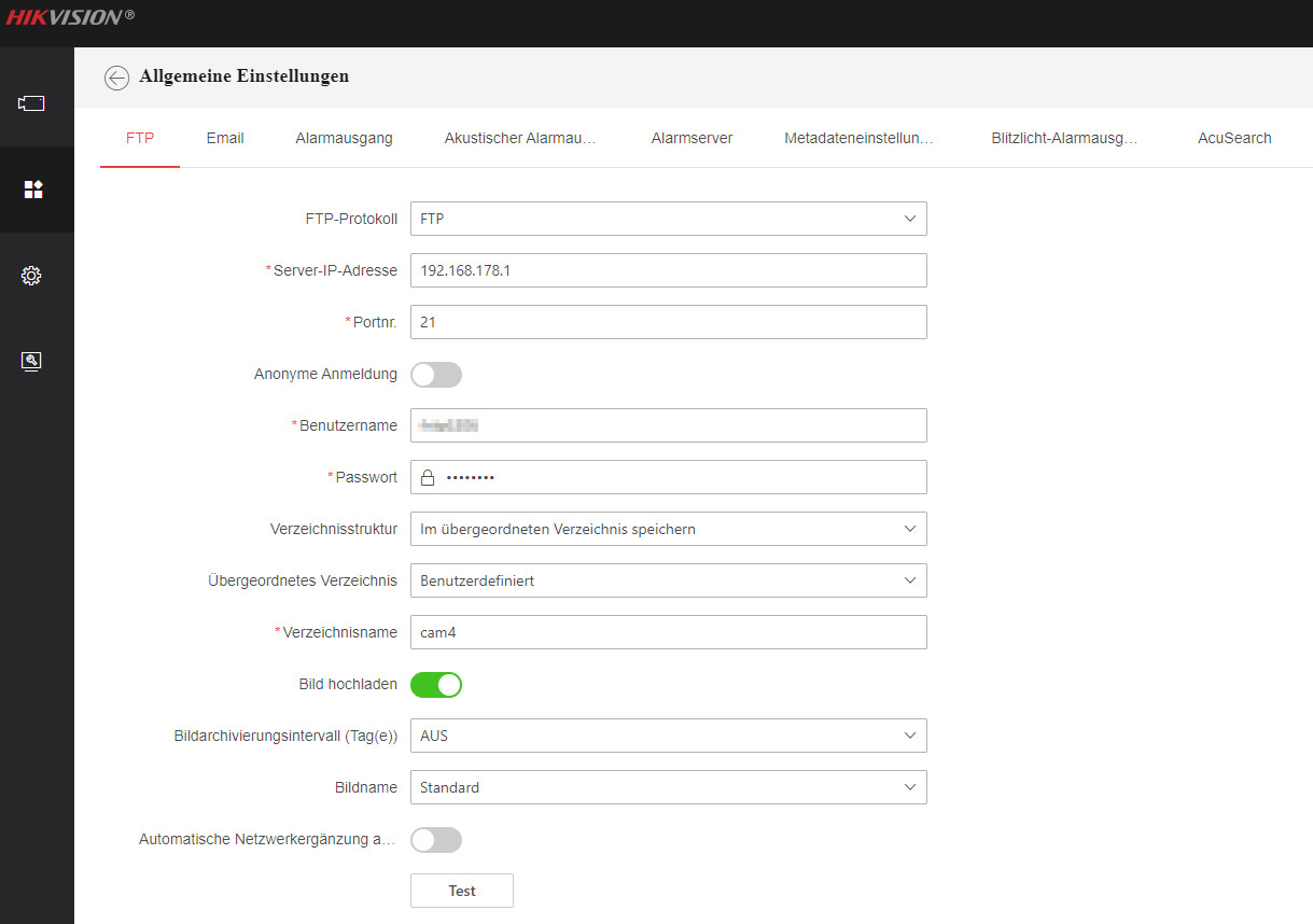 Mit diesen Einstellungen werden die Bilder einwandfrei bei jedem Ereignis im Ordner "cam4" weggespeichert. Mit zusätzlichem USB-Stick habe ich es nicht ausprobiert, könnte mir jedoch vorstellen das es am NTFS-Dateisystem deines Sticks liegt. Probier mal den auf exFAT oder FAT32 zu formatieren. Was passiert denn bei Euch wenn ihr auf "Test" klickt? Da wird ja auch direkt eine Test-Datei hochgeladen... |