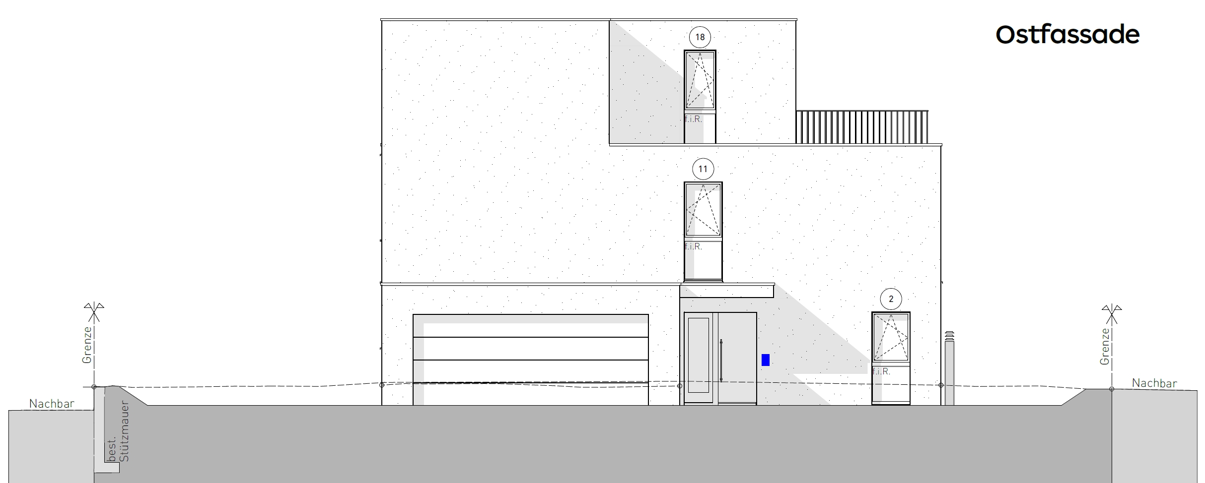 Die vom Elektriker vorgeschlagenen Standorte habe ich blau eingezeichnet auf den Zeichnungen der vier Hausseiten: