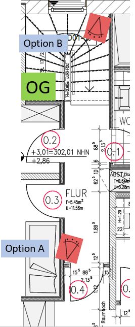 Als Nicht-Errichterin (meine Anmerkungen entstammen nicht aus einer Fülle von Erfahrungen) sind die Ausschnitte des Bauplans unzureichend, weil man die anderen Räume und Zugangsmöglichkeiten nicht zweifelsfrei erkennen kann.