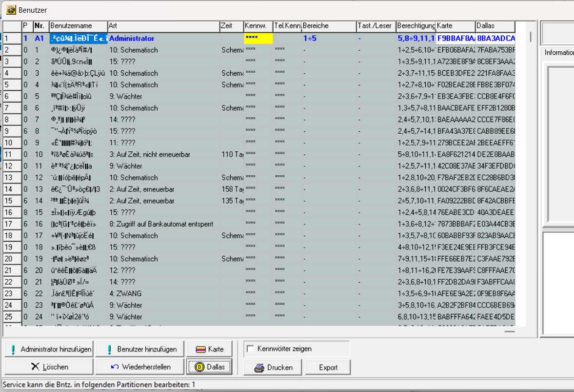 wenn die Liste der Benutzer SO aussieht, dann ist die kleine Knopfzelle leer, also richtig leer - und die Anlage war weder an der Netzversorgung noch am Akku angeschlossen. Benutzer werden nicht im Flash hinterlegt, daher werden sie mit "Unsinn" überschrieben wenn die Knopfzelle leer ist und keinerlei Spannungsversorgung anliegt. Lösung: Knopfzelle wechseln, Anlage starten, die Benutzer löschen (einfach im Servicemodus alle in einem Rutsch löschen) - dann neu anlegen oder aus alter Programmierung reinspielen. Die Knopfzelle ist genau dafür da - und wird nur im komplett spannungslosen Zustand der Anlage benötigt. |