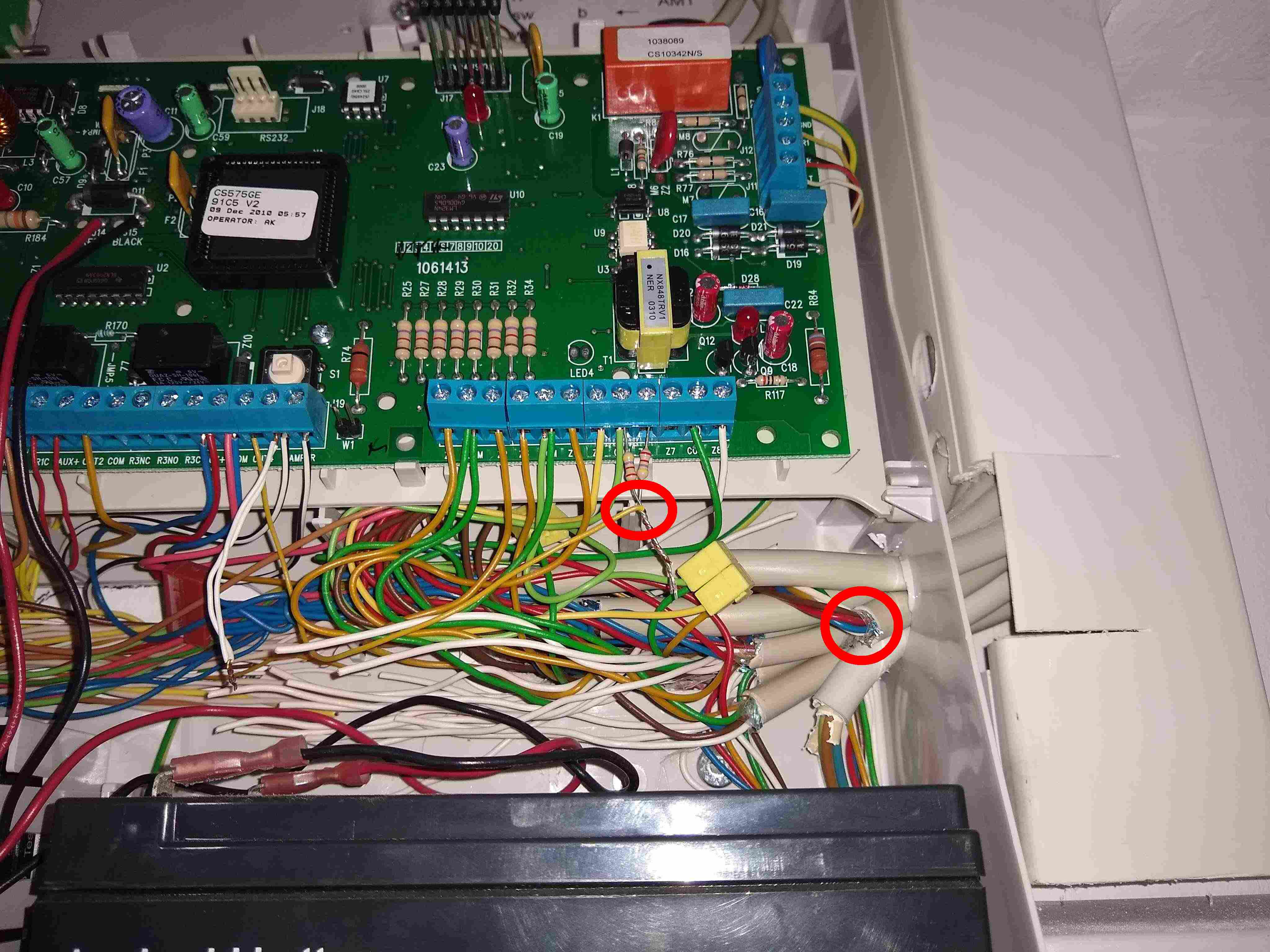 vielen Dank für Deine Antwort. Der Vorteil dieses Konnected Moduls ist, daß ich es auch als eigenständige Einheit weiterverwenden und die verkabelten Sensoren und Sirenen direkt anschließen kann, wenn die alte Zentrale nicht mehr funktioniert. Allerdings verliere ich dann die Funktion der drei vorhandenen Bedienteile, den RFID-Leser und einen Funkbewegungsmelder. Daher würde ich gerne die alte Zentrale noch so lange wie möglich belassen und das Konnected Modul nur als Brücke zu meinem Smart Home System verwenden. Der Nachteil dieser Art von alten Alarmanlagen ist für mich, daß ich sie schlecht bis gar nicht in mein Smart Home System integrieren kann, das hat mich schon lange gestört. Jetzt habe ich aber dieses Konnected Modul entdeckt, mit dem ich das zumindest größtenteils erreichen kann. Ich kann die Anlage dann z. B. von überall scharf und unscharf schalten, den Status einsehen und abhängig davon Automatisierungen laufen lassen und natürlich auch Benachrichtigungen erhalten. Außerdem kann ich die an der Alarmanlage verkabelten Bewegungsmelder auch für andere Zwecke nutzen, z. B. um Beleuchtungen zu aktivieren, auch wenn die Alarmanlage unscharf ist. Ich habe mal ein Bild der Zentrale angehängt. Da steht auch CS575 drauf. Die Zentrale hat 8 Zonen und 4 programmierbare Ausgänge. An der Zentrale sind an den Zonen 1-5 verkabelte Bewegungsmelder angeschlossen, an Zone 8 Sabotage Außensignalgeber und Zone 9 (die physisch aber anscheinen keinen Anschluß hat) ist der Funkbewegungsmelder. Dann hängen noch drei LCD-Bedienteile (wohl CS5500) dran, eine Außen- und eine Innensirene und ein RFID-Leser. Die Verkabelung in der Zentrale ist leider nicht beschriftet. Die grundlegende Verkabelung des Konnected Moduls könnte ich wahrscheinlich schaffen, aber ich komme mit der Anschluß- und Programmiertechnik der alten Zentrale über das Bedienteil nicht klar, obwohl ich eine Installations- und Bedienungsanleitung als PDF habe. Die Zone 7 ist frei (anscheinend auch die Zone 6, aber da sind Widerstände zwischen Z6 und COM angeschlossen, keine Ahnung wofür), da könnte man den Schlüsselschalter programmieren. Und dann benötige ich anscheinend noch zwei programmierbare Ausgänge, einen für die Statusmeldung scharf/unscharf und einen für die Meldung, daß Alarm ausgelöst wurde. Zumindest der Out4 ist anscheinend noch frei, da ist zwar ein organgefarbenes Kabel angeschlossen, das endet aber offen (auf dem Foto in der Nähe der Widerstände an Z6). Was für ein Kabel an Out2 angeschlossen ist, weiß ich leider noch nicht. Evt. geht das zu dem Telefonanschluß rechts oben, der sowieso nicht verwendet wird. Zur Not könnte ich das Kabel vielleicht einfach mal abklemmen. Wenn dann noch alles wie vorher funktioniert, kann man ja den Out2 auch für das Konnected Modul verwenden. Kann man das im Bedienteil evtl. abfragen, wie der Out2 verwendet wird? Ich vermute, wenn man sich mit der Programmierung einer solchen Anlage auskennt, ist das, was ich vorhabe, wahrscheinlich eine leichte Übung und wäre in 5 Minuten erledigt, aber ich fühle mich da sehr unsicher, irgend etwas falsch zu machen und an der Anlage etwas zu verstellen, daß sie hinterher nicht mehr richtig funktioniert. Danke und LG Alex |