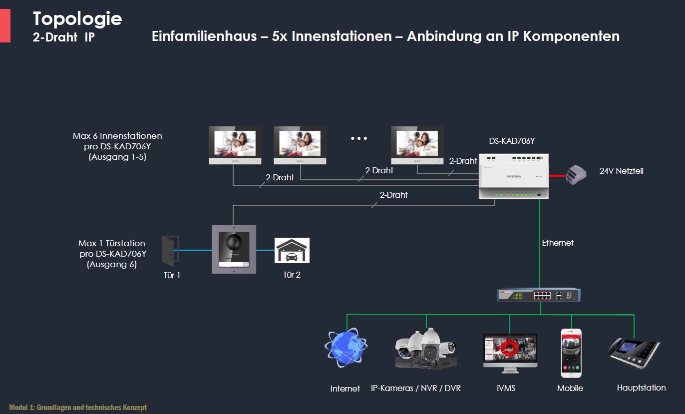 Ja, die Zentrale ist das IP-Gerät (DS-KAD704Y), dort gibt es nur die Kanäle 1-4. LAN-Anschluss und DC-Versorgungsklemme.