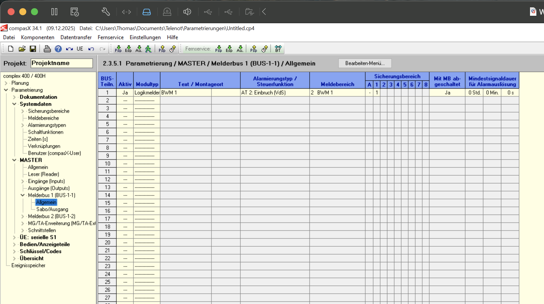 Wir reden aber von einer Telenot-Einbruchmeldezentrale, wie z.B. die complex 200/400(H) oder der hiplex 8400H? Ich frage nur, weil du beschreibst hier Sachen, die mir nicht bekannt sind. Also ich wüsste jetzt nicht, was das "Regelwerk im Melderbus" sein soll oder wie man dieselbe Busadresse auf demselben Busstrang zweimal anlegen kann. Ich hab mal von meinem compasX 34.1 einen Screenshot von der Melderbus-Sektion gemacht, so wie ich diese sehe. Da sind die Adressen programmseitig fest vorgegeben. Wenn ich jetzt eine weitere Zeile nutzen würde, wäre diese automatisch mit einer anderen Adresse versehen. Egal was ich mache. Damit ich nichts übersehe, habe ich die Discounterfunktionen aktiviert, auch wenn diese hierauf keinen Einfluss haben. Aktuell gehe ich davon aus, dass ich etwas übersehe. Kannst du mir da mal auf die Sprünge helfen, um deine Beschreibung zu verstehen? |