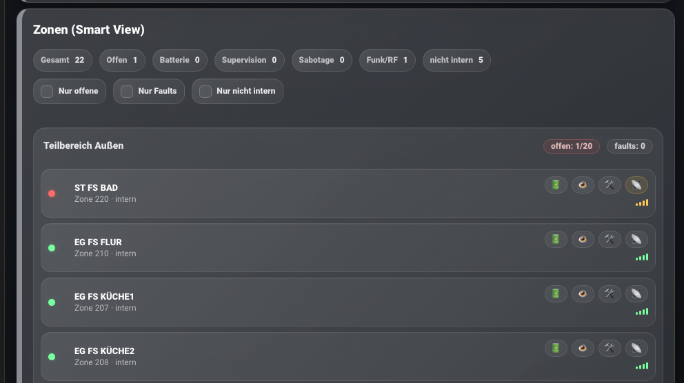 Die tabellarische Sicht auf die Komponenten der Funkzone ist fertig. Sicher funktionieren folgende Informationen als Anzeige in der Spalte zu jeder Komponente: Name, Zonen-ID (z B 205), Zustand (offen, geschlossen), Typ (Symbol für Fenster oder Tür), , Teilbereich, vermutlich Batterie…. Offen ob es geht Sabotage Aktuell nicht funktionsfähig RSSI Hat jemand eine Idee woher RSSI kommt? Also die Anzeige der Signalstärke. Vermutlich kann das alles einfach auch bei Euch laufen, ist ja bis auf die Dashboard Themen eine Integration. |