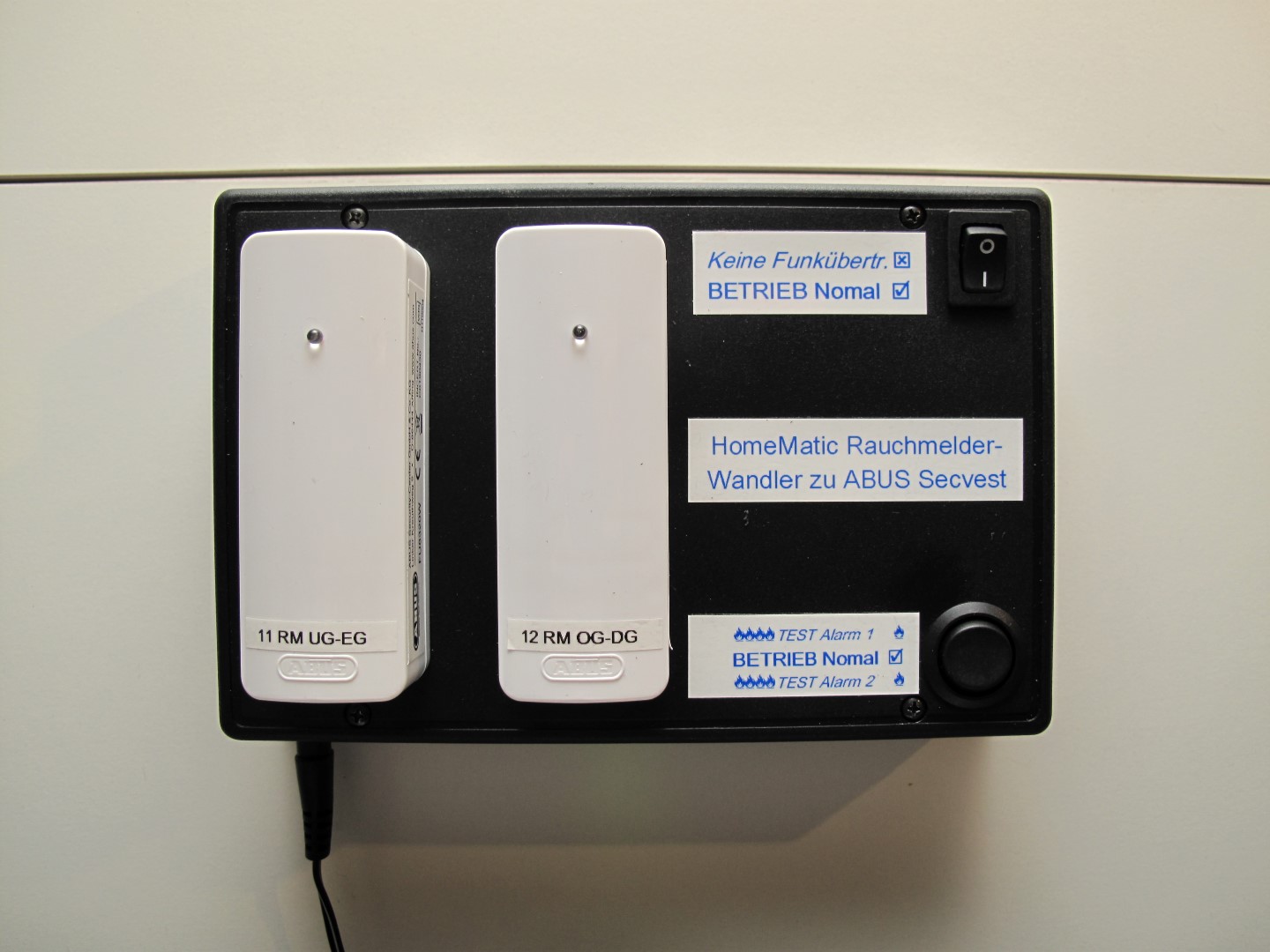 Wie in Foto 1 zu erkennen ist, machen die HomeMatic Funkrauchmelder einen optisch guten Eindruck, sind zuverlässig und funken sehr weit (ohne Probleme vom Keller bis ins Dachgeschoss): Auf Foto 2 sieht man das Gehäuse von Aussen mit den beiden Funkmelder, welche je zwei Geschosse als Alarm an die ABUS übermitteln (als Feueralarm): Auf Foto 3 und 4 sieht man die Innereien. Das HomeMatic Modul übermittelt (leider nur im NO Modus) den Alarm an das Funk Öffnungsmodul). Damit auch bei Stromausfall die Übermittlung funktioniert, schaltet bei Stromausfall das Relais und die 9V Batterie übernimmt die minimale Stromversorgung von 30mA der HomeMatic Steuerung: Damit ich zu Testzwecken einen Alarm der Gruppe 1 und 2 schicken kann, habe ich noch einen Impulstaster eingebaut. Und sollten die Rauchmelder ohne Grund dauernd auslösen, so kann die Verbindung zwischen HomeMatic und ABUS mit einem Schalter getrennt werden. Die Box steht bei mir im Keller, die Funkreichweite aller Melder liegen im grünen Bereich. Dies zur Info, falls jemand die gleichen Bedürfnisse haben sollte. Es grüsst GaRoMeSi |