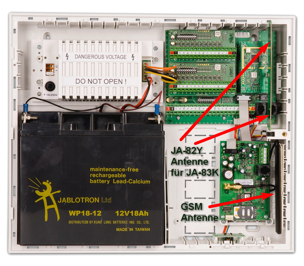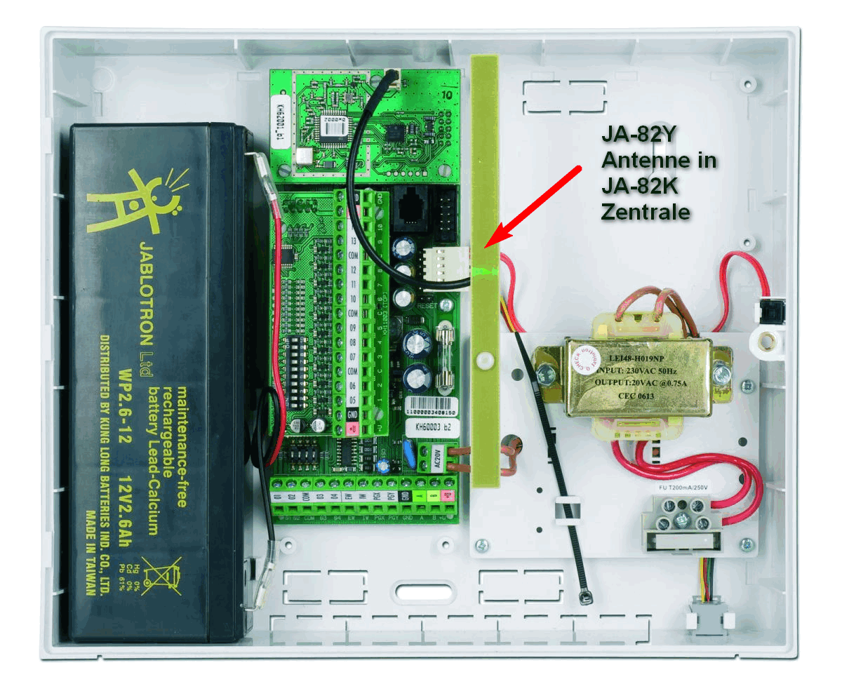 danke für dein Feedback. ![]() Ich habe soeben Dank der Google Bildersuche die Lösung dafür gefunden (denke ich mal ).Die linke der beiden Antennen, welche auch in der Verpackung der Zentrale JA-83K dabei war gehört in der Zentrale JA-83K auf das Funkmodul JA-82R draufgesteckt. Es gibt dafür auch eine Führung im Gehäuse wo die Antennen-Platine genau rein passt bzw. reingesteckt wird. Die rechte Antenne ist für die Zentrale JA-82K vorgesehen und wird dann in dieser Zentrale auf das Funkmodul JA-82R gesteckt. Das ist die Antenne welche verpackungstechnisch mit dem Funkmodul JA-82R mitgeliefert wird. Die GSM Antenne wird an der goldenen Buchse angeschlossen - am GSM Modul JA-82Y. Fotos anbei. Gesendet von meinem Taschenrechner |
