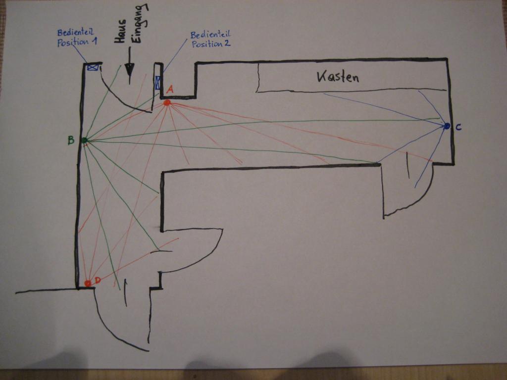(07-06-2014 12:21)Thomas_6683 schrieb: Hallo Rudi, Hallo Thomas, danke für die Beantwortung. Aber leider weis ich nicht welche Position beim Bedienteil tatsächlich die Ideale für Dich ist da Du 2 x von Pos. 1 sprichst. Zu Bewegungsmelder: Ja stimmt, bei den Winkel habe ich diese irrtümlicherweise tatsächlich zu groß eingezeichnet. Nach Korrektur der Winkel, tendiere ich zu Pos. B da mich dann beim Öffnen/Betreten des Hauses der BM nicht erfassen wird, jedoch der Eindringling von allen 3 Zimmern (in die er durch die Fenster kommen könnte) beim Betreten des Vorraumes erfasst wird. Gruß Rudi |