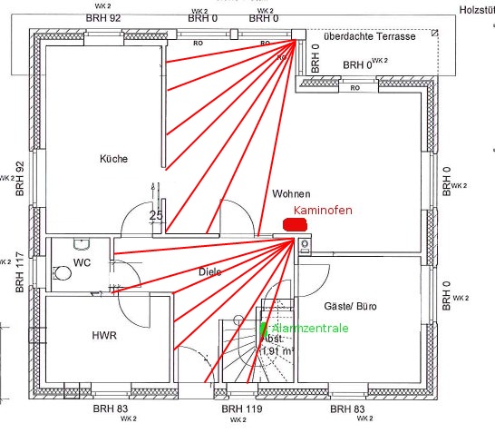 Zusätzlich Plane ich noch Bewegungsmelder einzusetzen. Hierbei stellt sich mir insbesondere die Frage wie man diese im Wohnzimmer anordnen sollte. Hier machen mir die Fenster und der Ofen Probleme (eins von beiden ist irgendwie immer im Sichtbereich)