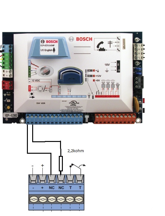 also wenn ich das richtig lese, arbeitet der Melder mit einen Alarmkontakt, der im Ruhezustand geschlossen ist. Somit musst du den Widerstand in Reihe schalten. Ich hoffe das hilft. Grüße Siehe Bild. Dann musst du bloss noch die Linie auf Alarm mit/ohne Verzögerung oder Innenbereich einstellen. Das kannst du dann noch mit dem Sabotagekontakt (Anschlüsse "T") genau so machen. Nur das du den dann auf 24-h Alarm einstellen solltest. |