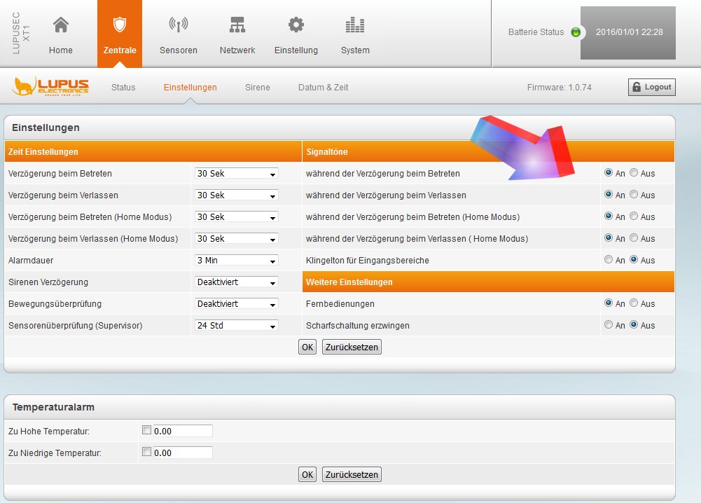 hast du vielleicht eine längere Ausgangsverzögerung aktiviert? Zentrale -> Einstellungen -> Verzögerung beim Betreten / Verlassen ? Du kannst den Signalton auch austellen in der Spalte daneben. Gruß |