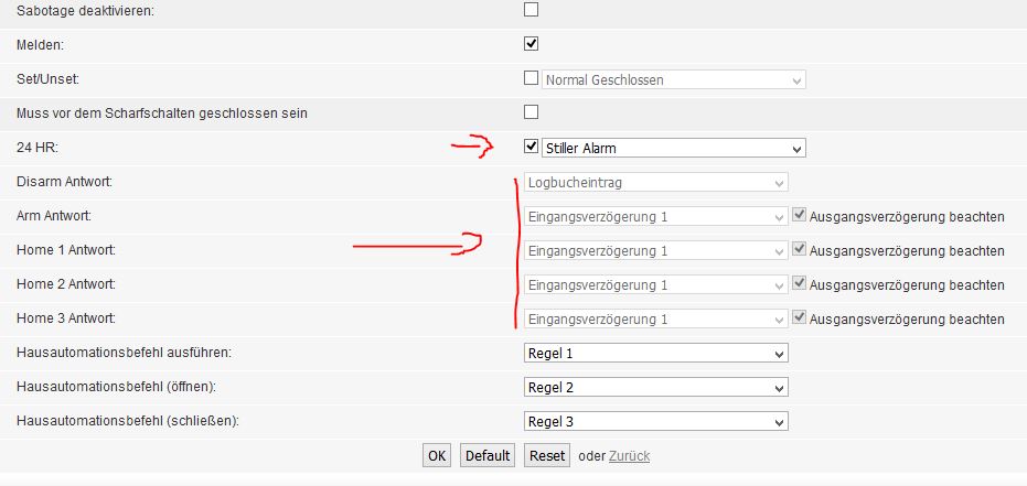 Du hast es in deinem Bildschirmfoto markiert. Es ist dann egal, ob die Anlage scharf ist oder unscharf. Die Reaktion in Deinem Fall ist stiller Alarm. (Feld neben 24 hr)