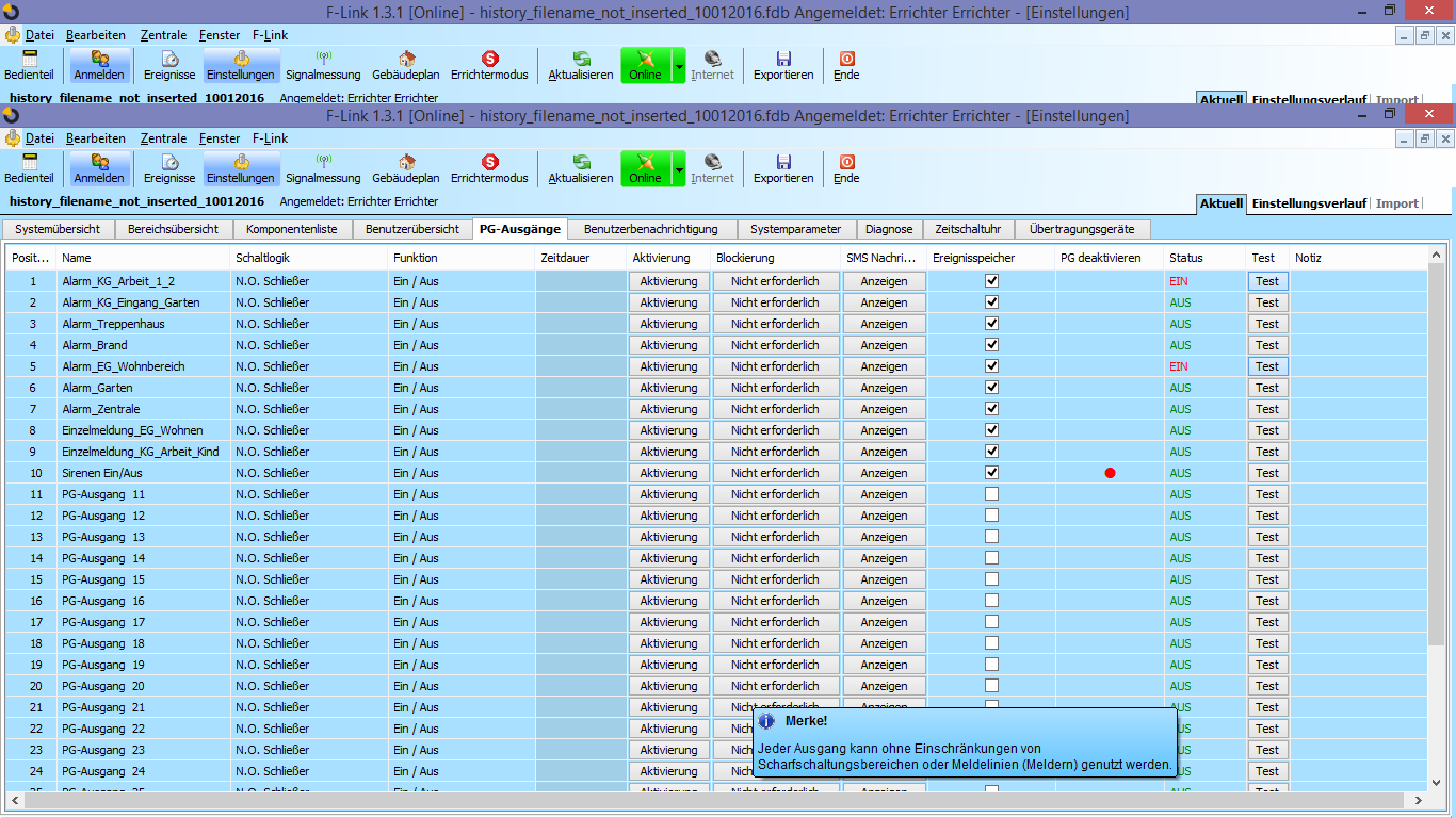 2. Warum die ganzen Einzelmeldungen per PG ? Du bekommst so oder so bei der Alarmmeldung den Melder angezeigt welcher ausgelöst hat. Weiter müssten die ganzen PG´s dann auch blockiert werden zb. wenn Bereich x unscharf ist das geht über die Funktion Blockierung bei den PG Ausgängen.