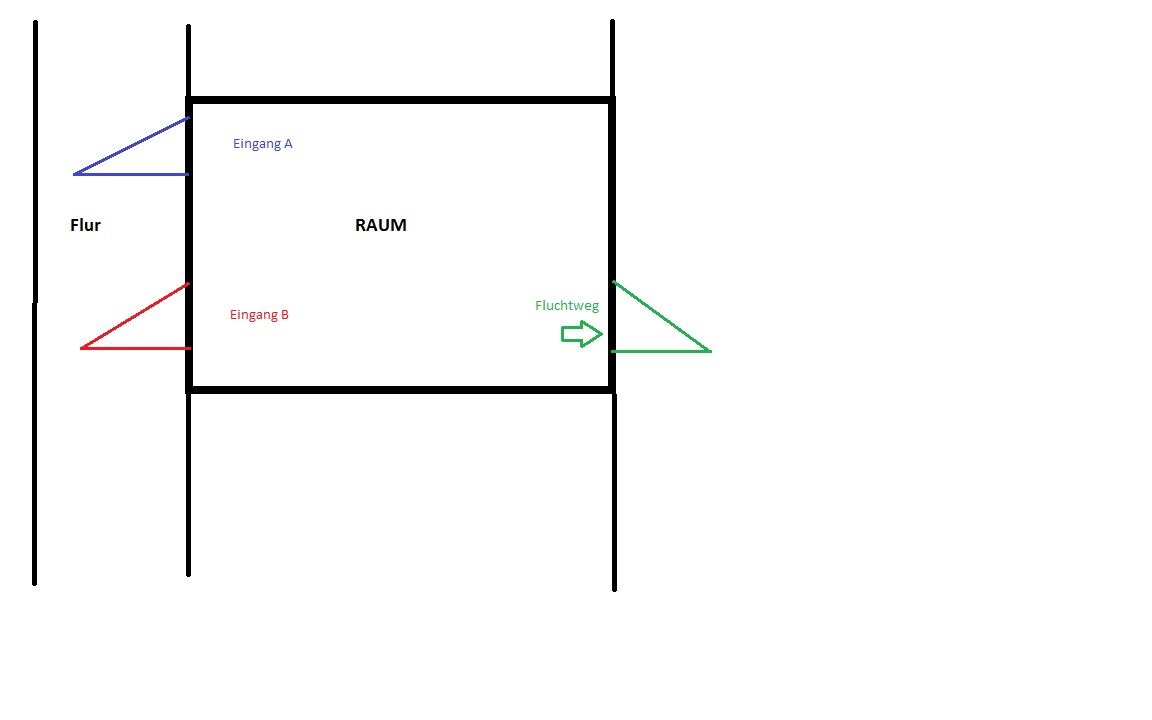 ich hab eine Frage und zwar gibt es eine Vorschrift für die Lage für Fluchttüren für einen Raum, welche direkt ins Freie führen ? Ich habe mal eine kleine Skizze erstellt als Beispiel. Ist es egal ob die Türe (womit ich den Raum betrete) gegenüber der Fluchttür ist (Eingang B) oder muss es so angeordnet sein, dass diese immer versetzt ist (Eingang A) ? Zur Info, es handelt sich um einen Klassenraum in einer Schule. Bei NW-Räumen ist es ja gefordert, dass die Türen versetzt voneinander liegen. Danke! |