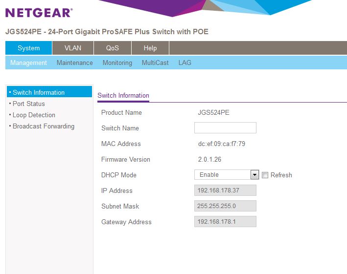 Also, ich habe einen Netgear JGS524PE Switch.