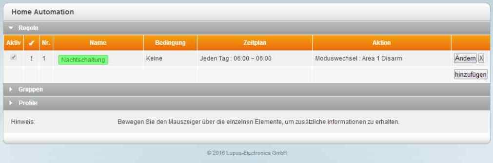 wohl eine einfache Frage, bin mir aber unsicher und kenne mich mit der Anlage noch nicht so gut aus ![]() Die Anlage soll morgens zu einer bestimmten Zeit immer automatisch aus gehen. Abends dagegen soll sie von Hand scharf geschaltet werden.... Ich gehe auf Home-Automation und setze folgende Regel: Bedingung: keine Zeitplan: jeden Tag 08:00 - 00:00 Aktion: Zone ausschalten Zone 1 / Area 1 Ist das richtig oder muß eine "Endzeit" evtl. auch auf 08:00 Uhr gesetzt werden, damit danach tagsüber wieder manuell geschaltet werden kann? Vielen Dank und LG |
