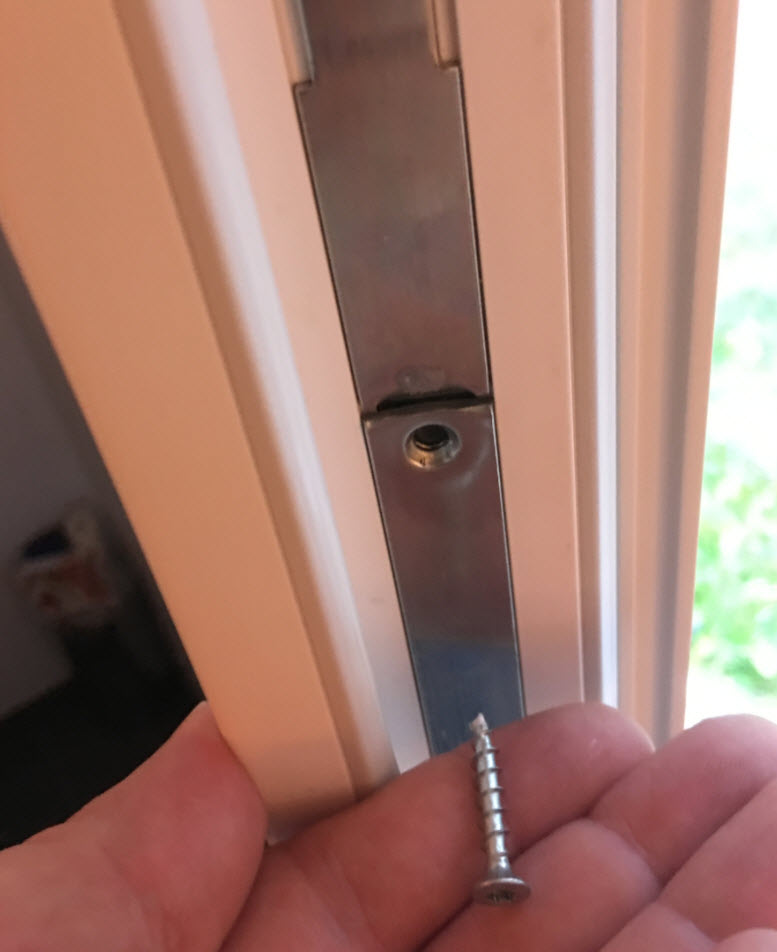 So etwa an einer meiner Terrassentüren. Ich habe nur 2 statt 4 Schrauben verwendet und habe auch nur in den Doppelsteg geschraubt, nicht ins Metall. Die Sabo-Kontakte habe ich vorsichtshalber ausgeschaltet.
